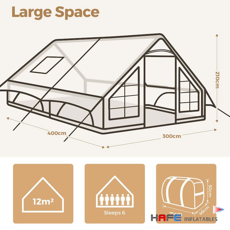 Experience the next level of outdoor comfort with our 4m Inflatable Camping Tent, designed to make camping easier and more enjoyable. Whether you're heading out on a family adventure, a group outing, or just a weekend escape, this tent redefines convenience with its quick inflation design, spacious interior, and durable construction.